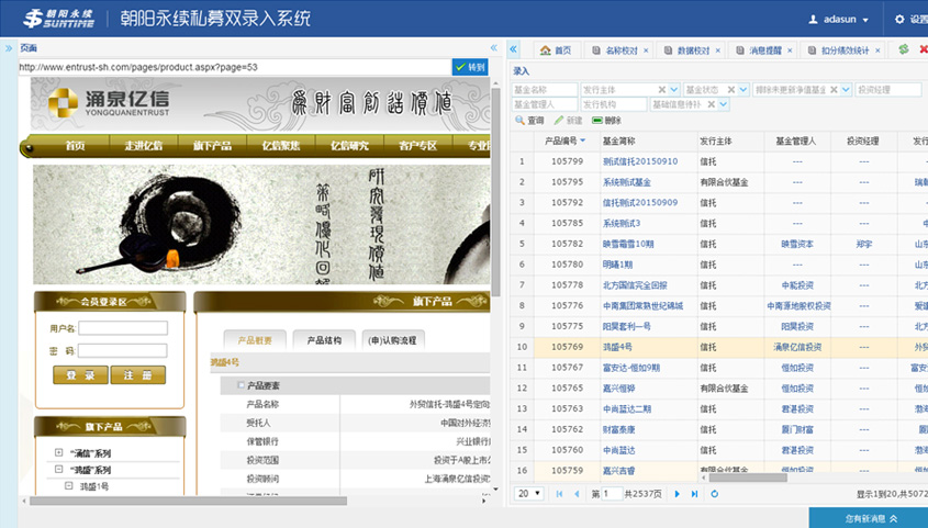 朝陽永續(xù)私募雙錄入項(xiàng)目是重構(gòu)項(xiàng)目,主要用來實(shí)現(xiàn)基于金融報(bào)告等的數(shù)據(jù)的錄入、校對(duì)。系統(tǒng)實(shí)現(xiàn)了管理員對(duì)錄入和校對(duì)人員進(jìn)行授權(quán)并對(duì)錄入人員進(jìn)行分組,錄入人員1和錄入人員2使用平臺(tái)錄入數(shù)據(jù),校對(duì)人員進(jìn)行校對(duì)、扣分、一致提交入庫(kù)等操作。系統(tǒng)通過雙錄入和校對(duì)機(jī)制從而減少了數(shù)據(jù)錄入的錯(cuò)誤率,提高了數(shù)據(jù)準(zhǔn)確性。