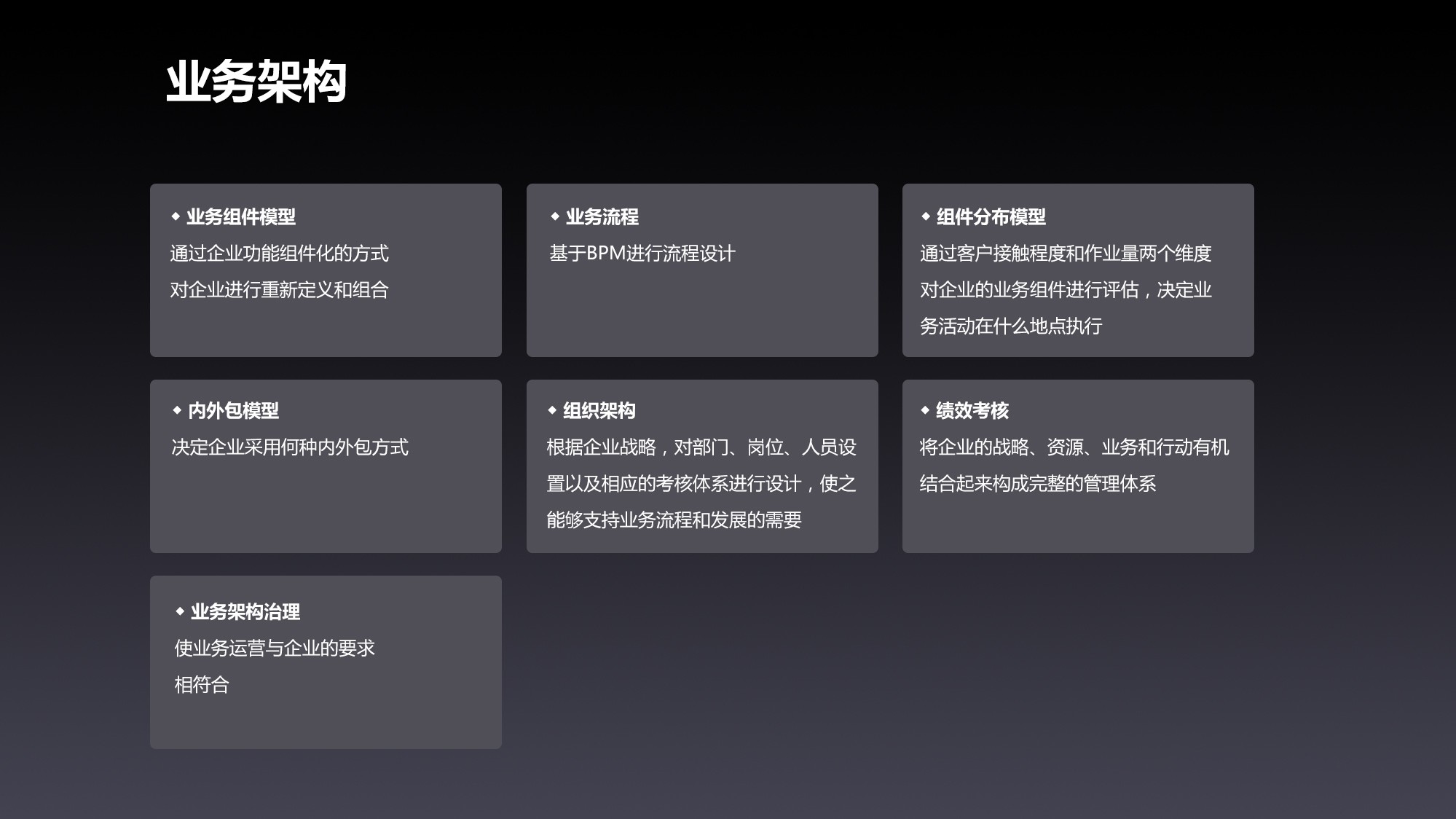 基于BPM設(shè)計業(yè)務流程,結(jié)合管理層ARC - ERP系統(tǒng)與“樞理”數(shù)據(jù)治理,梳理、優(yōu)化流程,消除冗余環(huán)節(jié),提升運轉(zhuǎn)效率;借組件分布模型,從客戶接觸程度和作業(yè)量維度,評估業(yè)務組件,合理規(guī)劃業(yè)務活動執(zhí)行地點,降低運營成本;以內(nèi)外包模型,科學決策業(yè)務外包方式,聚焦核心競爭力;依據(jù)戰(zhàn)略設(shè)計組織架構(gòu),適配部門、崗位、人員及考核體系,為業(yè)務流程筑牢組織支撐;通過績效考核,串聯(lián)戰(zhàn)略、資源、業(yè)務與行動,構(gòu)建完整管理體系;依托業(yè)務架構(gòu)治理,確保業(yè)務運營貼合企業(yè)要求,讓戰(zhàn)略落地“看得見、摸得著”。